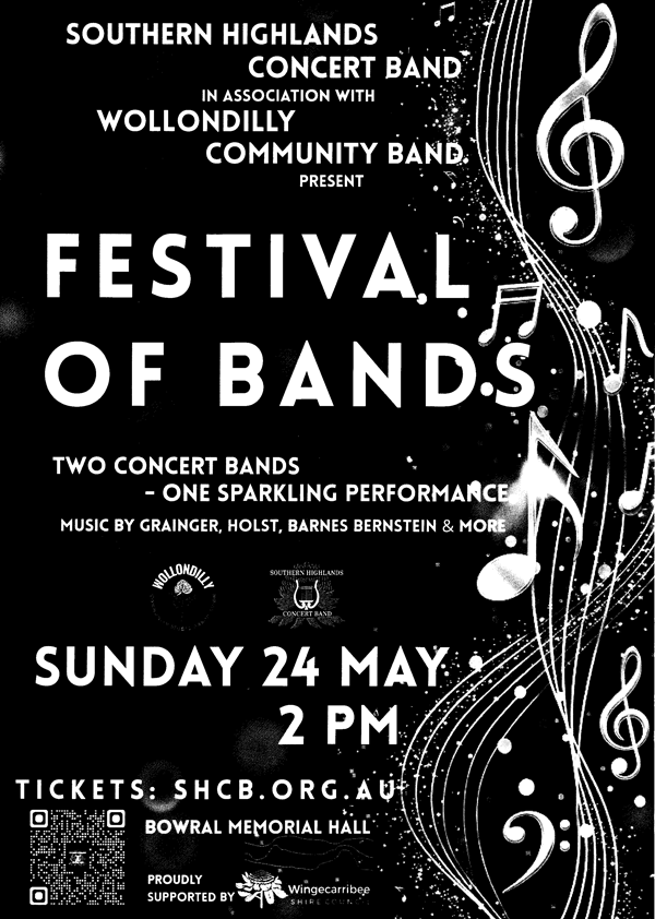 The Southern Highlands Concert Band and their neighbours, The Wollondilly Community Band, join forces to present a concert of sparkling band music by Percy Grainger, Gustav Holst, James Barnes, Leonard Bernstein and others.